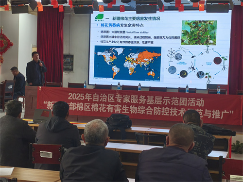 近日,植保所国家棉花产业技术体系枯黄萎病防控岗位科学家赵卫松研究员受邀参加“新疆南部棉区棉花有害生物综合防控技术示范与推广专家服务基层示范团活动”,该活动由新疆维吾尔自治区人社厅主办,新疆维吾尔自治区农业科学院植物保护研究所承办。