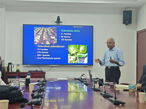 随后,植保所植物病害生物防治研究室赵卫松研究员作了题为 “Integrated Prevention and Control Technology for Cotton Verticillium Wilt and Microbial Remediation of Saline-Alkali Soil in Cotton Fields”的报告,介绍了棉花黄萎病综合防控及盐碱地微生物修复技术;曲远航助理研究员作了题为 “Application of Spent Mushroom Substrate in Suppressing Fusarium Wilt” 的报告,介绍了利用菌糠抑制枯萎病的最新研究进展。土壤检测中心王培培研究员重点展示了通过检测土壤中病原菌含量来为病害预测预报提供依据的技术体系。Subbarao 教授对植保所在植物病害防控及有益微生物利用等方面的研究工作表示肯定,并就未来的研究方向和合作机会提出了建议。